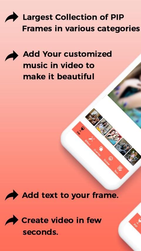 is one the simplest video maker which have all simple way to decorate video clip with unique style and in this application you have chosen to make PIP video clip with your images, so share something new to anyone with sharing PIP video clip.application with you can share direct a video clip with using share option. it has simple User Interface to use application.