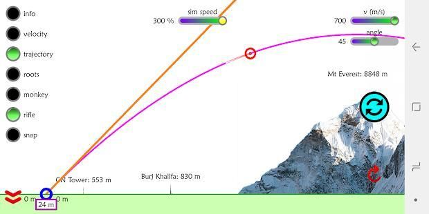 3) ऊपर दाईं ओर स्थित स्लाइडर आप गति और प्रारंभिक वेग के इच्छा को बदलने के लिए अनुमति देते हैं।