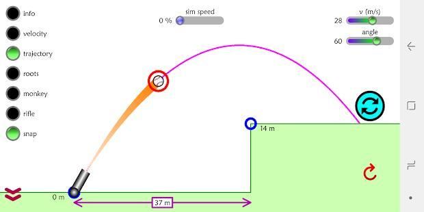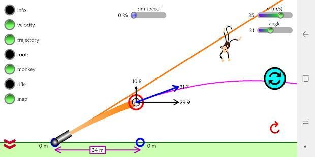 इस अनुकरण उपयोगकर्ताओं को किसी भी कोण पर एक लांचर, और अलग अलग गति और उन्नयन से प्रोजेक्टाइल आग अनुमति देता है। अनुकरण भी प्रक्षेप पथ, समाधान को प्रदर्शित करता है, फेंकने पर फ्रेम दर फ्रेम जानकारी देता है, एक राइफल और प्रसिद्ध बंदर शिकारी सोचा प्रयोग की गति simulates।