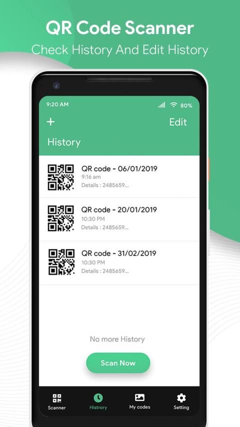 इतिहास देखें: स्कैन इतिहास ऑटो सभी उत्पन्न या स्कैन किए गए QR कोड और बारकोड के लिए सहेजा गया है।