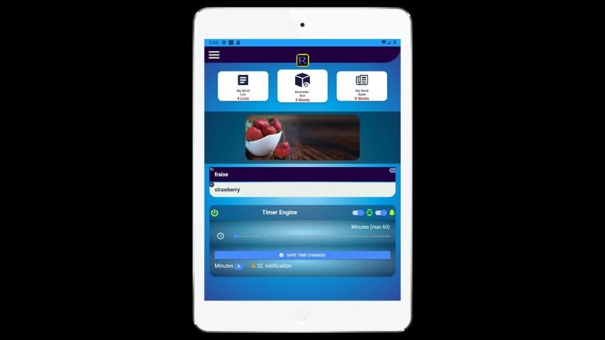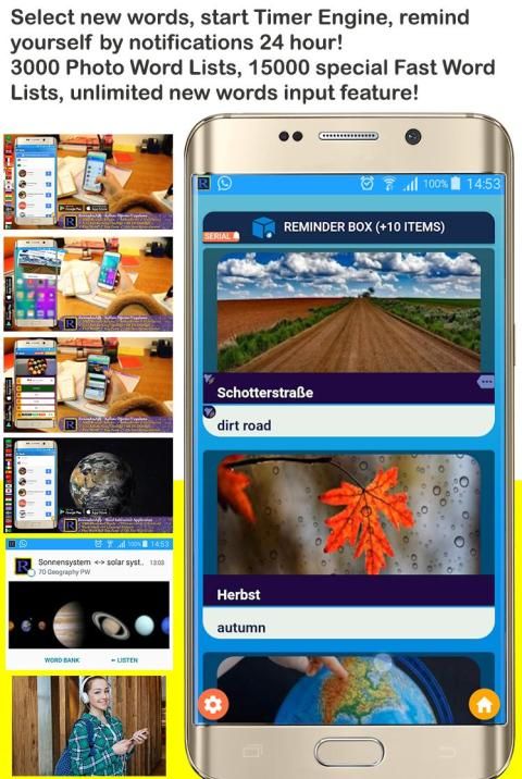 रिमाइंडर ऐप बाइनरी शब्द को एक अधिसूचना के रूप में उपयोगकर्ता को भेजता है जो कि समय अवधि में होता है। इसमें हर जगह शब्द देखने और सुनने के लिए एक "प्ले वर्ड" सुविधा है। यह सीखने के नए शब्दों को तीव्र करने के लिए "टेस्ट" सुखद सुविधा भी प्रदान करता है। रिमाइंडर ऐप में 30 श्रेणियों में 3.000 फोटो शब्द हैं, जो वोकलिज़ेशन के साथ 21 भाषा समर्थन करते हैं। स्थायी सीखने के लिए दृश्य और श्रवण की आपूर्ति करने की सुविधा। इसे एक "प्रैक्टिकल डायलॉग्स" लिस्ट लाइब्रेरी फीचर मिला है, जिसमें उपयोगकर्ताओं के लिए तैयार विशेष विषयों के रूप में दर्जनों भाषा में हजारों शब्द शामिल हैं।