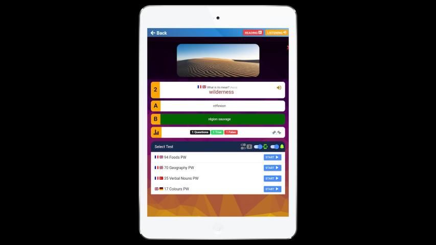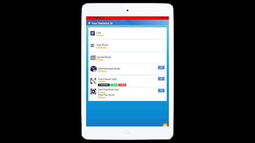 ➤ Test is a multiple choice testing but a different design according to neuro learning strategy. Users can open their lists by using fast “Go Test” button or can open through main menü Test Zone option. Then users can start test for consolidate the learning process. Test Zone has got a unique multiple choice options that the users can