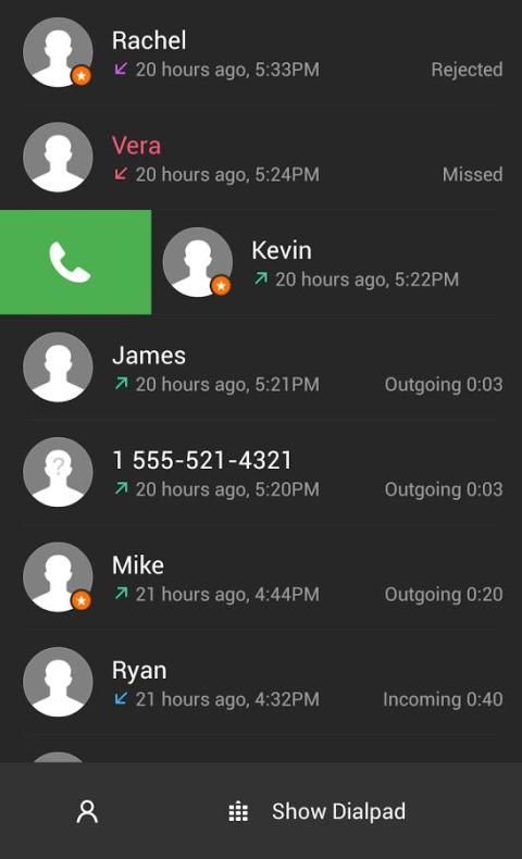परिपत्र संपर्क तस्वीरें और कस्टम फ़ॉन्ट के साथ exDialer के लिए न्यूनतर अंधेरे विषय।