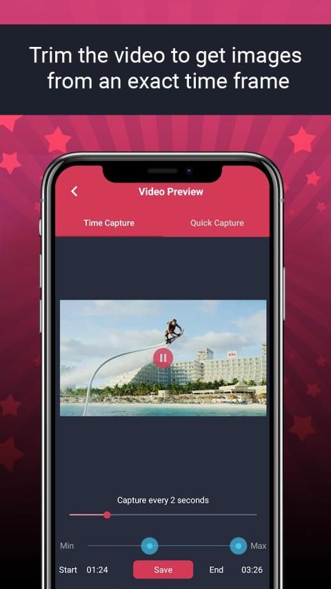 Video to Photo - Image Extractor application is to capture the images from video. It provides the instant snap features which help to takes snapshot from the video. Using this app you can get a photo from a large video. You can trim the video to get images from an exact time frame. During the image grabbing, you have asked for a number of seconds as input which applies for extract image of each second in your video.