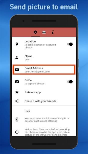 The program of filming who tries to open the phone is an alarm against theft and also filming the intruder who opens your phone without your knowledge and takes a picture of the intruder also is the process of finding the lost phone by filming the intruder if he tried to open the device and take a picture and send it through your email with a place His presence and who touched my phone camera .