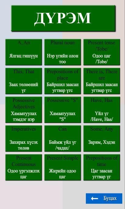 इंटरएक्टिव कक्षा एक पत्र है, जो एक ही समय में संख्या और स्वर, व्याकरण, शब्दावली कॉल्स और सचित्र ट्यूटोरियल भी शामिल है। में प्रवेश किया और प्रारंभिक चरण में पता करने के लिए आवश्यक नियमों अभ्यास परीक्षण और वाक्य में अनुवाद में दी गई है। इस नियम के batjuulana ज्ञान है।