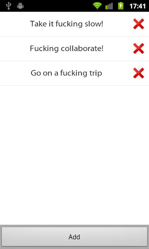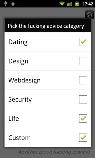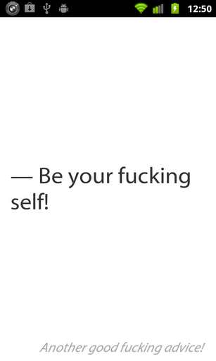 quot;Fucking Good Advicequot; gives you good and motivational fucking advices on a wide range of topics. No more Mr. Nice Guy We don39;t suggest, we tell you how you should fucking do it If you are too lazy to open the app we will even provide you with a fucking widget Just fucking tap to get a new advice Add your own good fucking advices in a special quot;customquot; category Have a complaint? Mail it to me. A suggestion? Mail it. Have some good fucking advice? Mail it And check for a fucking updates. We will be adding some new fucking good advices, so you wouldn39;t fuck up in the real life