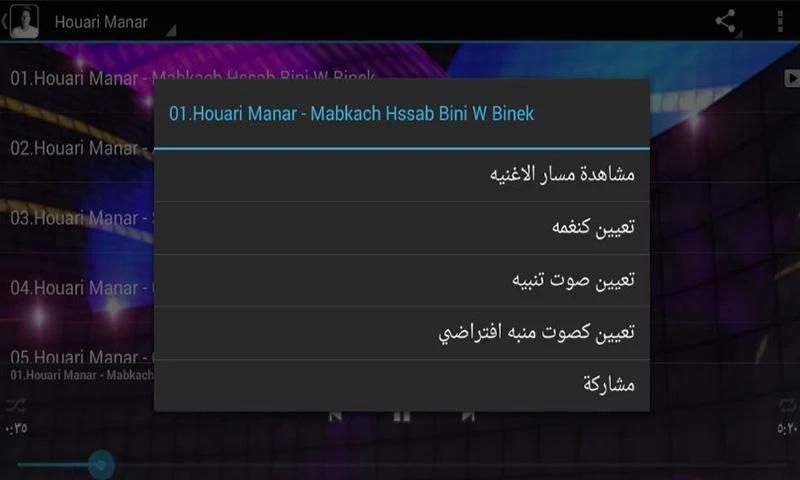 एप्लिकेशन गीत शेख होउरी मनार में सबसे प्रसिद्ध गाने "हाउरी मनार" हैं, जिन्होंने सफलता हासिल की है, और इंटरनेट के बिना काम के गाने, साथ ही साथ गाने और एप्लिकेशन को अपने दोस्तों के साथ साझा कर सकते हैं।