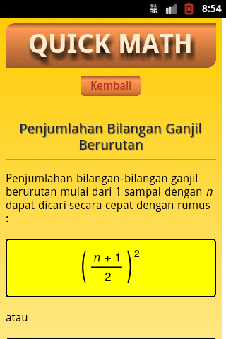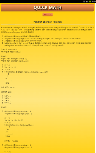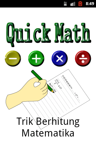 Quick Math berisi Pelajaran Dasar Matematika dan Trik Berhitung Cepat. Ditujukan terutama untuk siswa Sekolah Dasar, Sekolah Menengah Pertama serta Masyarakat umum. Berisikan rumus-rumus untuk membantu berhitung secara cepat dan beberapa konsep dasar matematika, serta soal-soal latihan dan kalkulator yang akan terus