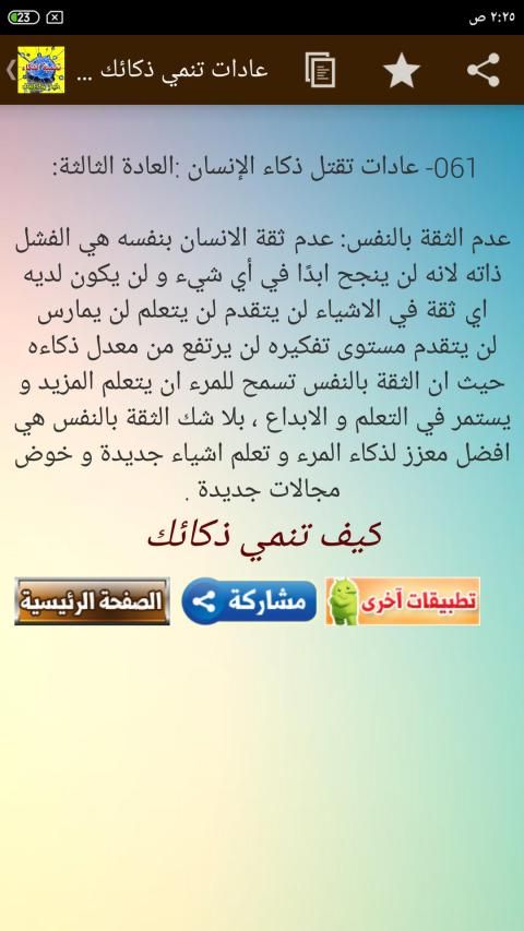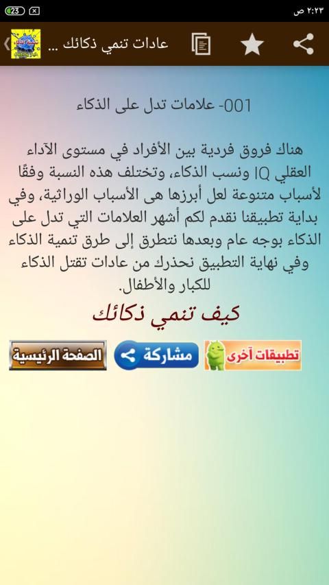 هناك فروق فردية بين الأفراد في مستوى الآداء العقلي IQ ونسب الذكاء، وتختلف هذه النسبة وفقًا لأسباب متنوعة لعل أبرزها هى الأسباب الوراثية، وفي بداية تطبيقنا نقدم لكم أشهر العلامات التي تدل على الذكاء بوجه عام وبعدها نتطرق إلى طرق تنمية الذكاء للكبار والأطفال وكيف تنمي خيالك.. وفي نهاية التطبيق تحذير من عادات تقتل الذكاء .