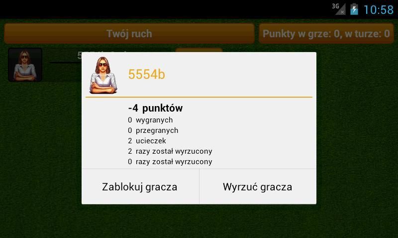 - gracz ma 60 sekund na wykonanie ruchu, po tym czasie zostaje usunięty z gry z punktem karnym (ucieczka)