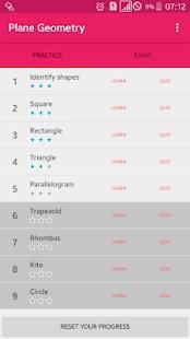 This app offer a game that will assist the player to learn about plane/2D geometry and test his/her knowledge by exercising against auto generated quiz provided on each topic.