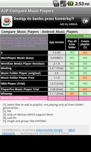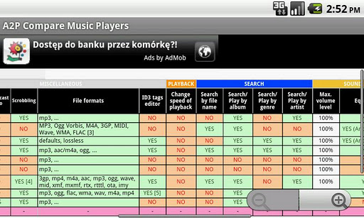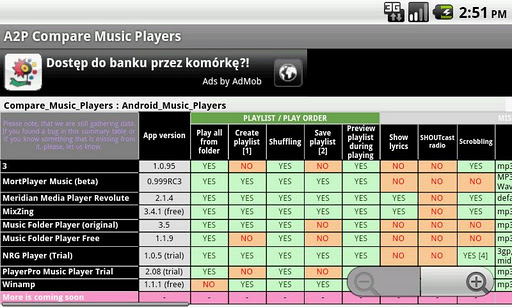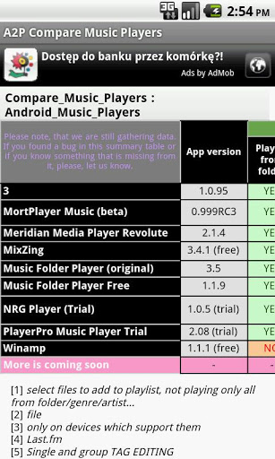 Compare Android music players and choose those that suit You bestThe features and players are compared in a table.You can also view the comparison in a web browser https:sites.google.comsitecomparemusicplayersAlso applicable terms: sound players, audio audiobook, audio book, change play speed, faster playback, repeat, play folder, playlists, search by albums, scrobbling, ...