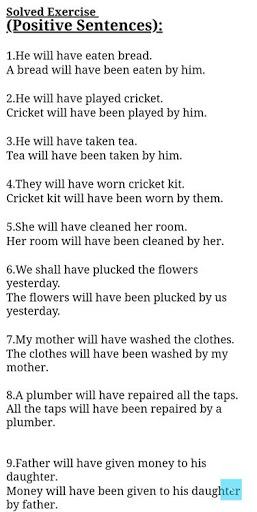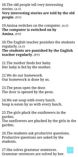 Konversi suara aktif dan pasif untuk semua jenis kalimat seperti kalimat positif, kalimat negatif, kalimat interogatif, kalimat interronegatif, dari semua bentuk kata yang dapat dikonversi menjadi suara pasif termasuk kalimat asertif, kalimat imperatif, dan hukuman opatif dengan lebih dari1600 diselesaikan kalimat.