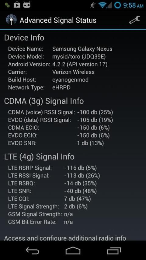Use the info contained in this app to monitor your current signal and find dead spots around your home and office. Also useful for complaining to tier 2 tech support with your carrier when your signal sucks. Be informed and use what they know to your advantage!