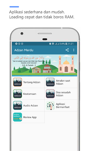 Aplikasi mudah digunakan dan tidak memerlukan jaringan internet untuk menjalankan aplikasi Kumpulan Adzan Terbaru Mp3.