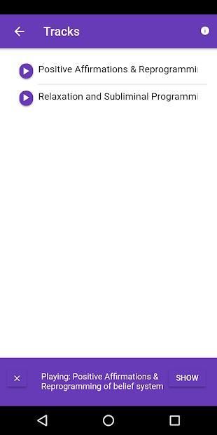 Afirmasi untuk aplikasi Transformasi Kehidupan menawarkan beberapa jalur afirmasi yang akan membantu Anda menargetkan berbagai masalah (misalnya: Stres) yang dihadapi generasi saat ini. Dengarkan lagu-lagu ini sesering mungkin untuk memprogram ulang pikiran Anda dengan pikiran positif.