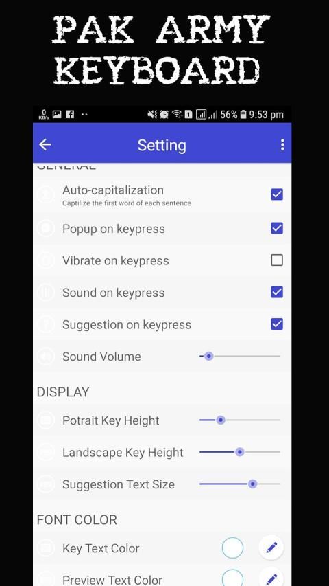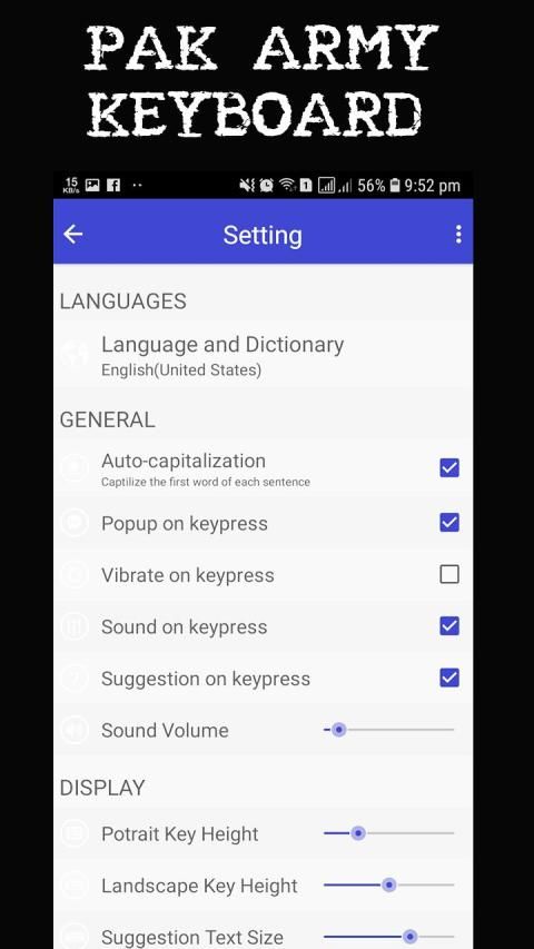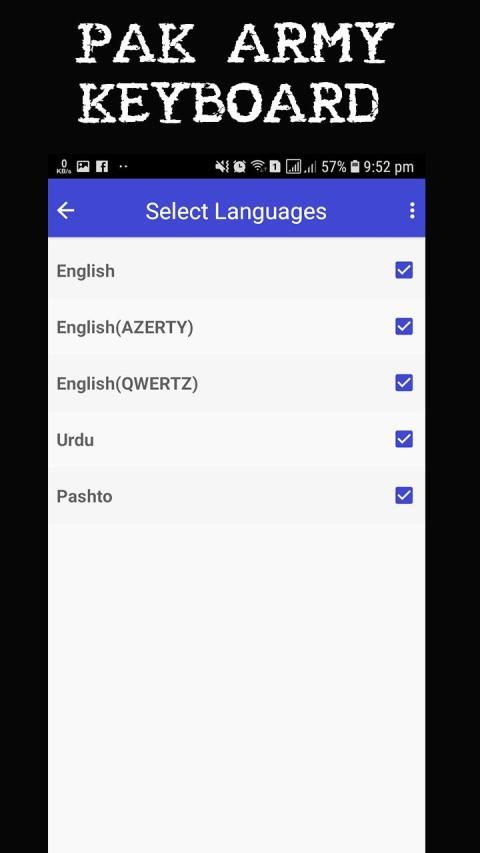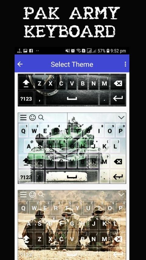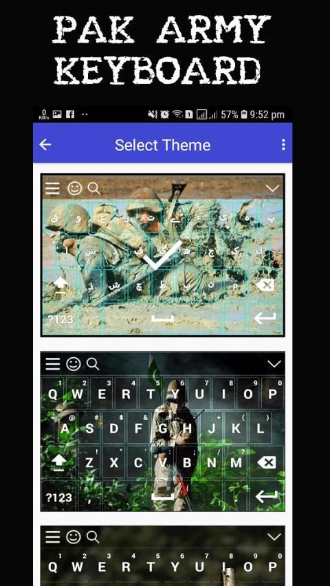 Keyboard Pakistan Army adalah salah satu keyboard teratas yang pernah Anda lihat, ia memiliki banyak tema tentara yang indah, ia memiliki banyak fitur yang tentu saja akan menjadi kebutuhan setiap pria dan wanita Pakistan, pakaian tentara Pakistan dan keyboard pakaian ini sangat mudah keyboard urdu dan pashto. Keyboard yang sangat bergaya terdiri dari tema tentara pakistan, Anda juga dapat mengatur foto Anda sendiri pada keyboard, 14 Agustus 2019 tema, tema paradigma tentara.