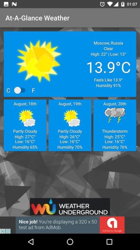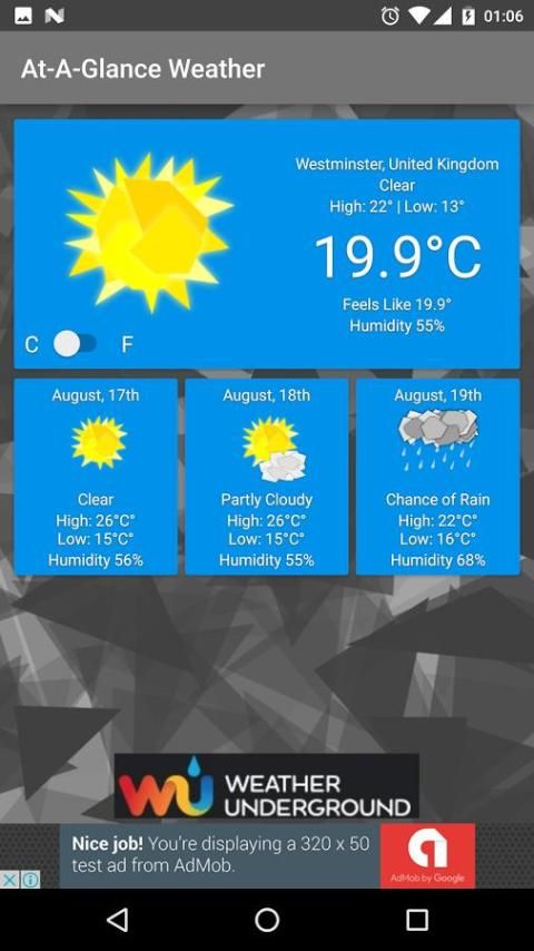 Alih-alih mencoba untuk menavigasi website rumit atau aplikasi yang kompleks At-A-Sekilas Cuaca menunjukkan kondisi cuaca saat ini dan perkiraan 3 hari dalam mudah sederhana untuk membaca desain yang membuat mengetahui semua informasi yang cepat dan mudah.
