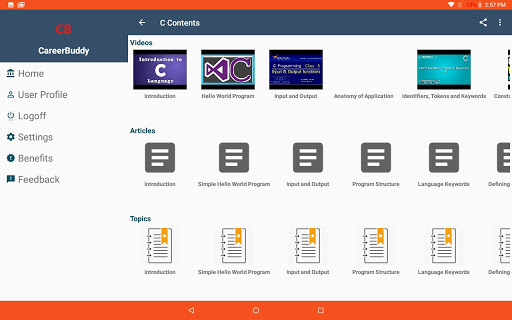 Selain itu karirBuddy juga memiliki jumlah kursus gratis seperti: pemasaran digital, pengembangan aplikasi Android, struktur data, pola desain, C, c , java, c #, asp .net, php, html, skrip java