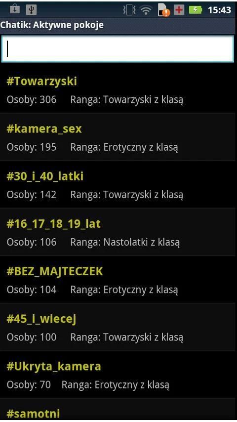 Ze względu na dużą liczbę wszystkich istniejących pokoi na liście wyświetlane są tylko pokoje w których ktoś jest. Żeby wejść do dowolnego, także pustego, pokoju trzeba skorzystać z opcji menu "wejdź do pokoju".