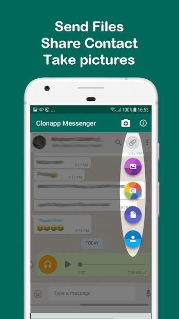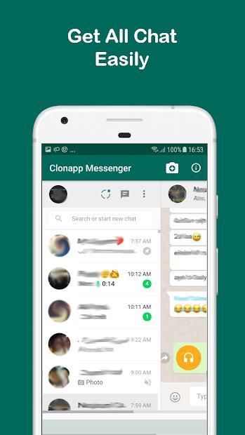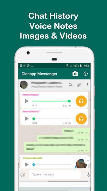 * Clonapp Messenger: This is the main feature where you can Clone Your WhatsApp account and use it on another phone or tablet. Also you can send and receive chat, media and voice notes.