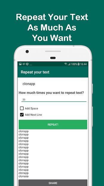 * Text Repeater: dengan repeater teks Anda dapat memasukkan teks apa pun yang Anda inginkan dan mengulanginya beberapa kali hanya dalam 1 detik untuk membaginya dengan obrolan jejaring sosial lain atau menyalinnya untuk digunakan di tempat lain.