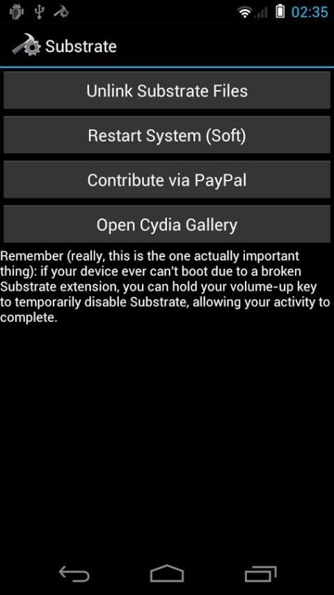 (Pengguna Substrat pada iOS mungkin ingat bahwa ada yang lebih umum "Safe Mode" fitur yang akan menangkap crash, memungkinkan untuk respon yang lebih intuitif untuk kegagalan ini akan dilaksanakan dalam versi mendatang Substrat untuk Android, tapi tolong diingat.: Anda selalu dapat menggunakan "volume atas untuk menonaktifkan" fitur untuk melewati ekstensi buruk.)