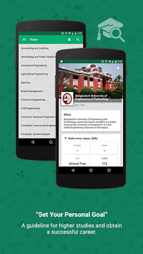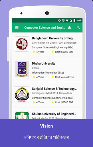 1. Visi: Untuk konseling karir Aplikasi ini memiliki daftar karier yang diinginkan dengan deskripsi singkat dan persyaratan dasar untuk pekerjaan itu. Daftar universitas yang menawarkan kursus yang diperlukan ini dan biayanya juga disertakan. Pikirkan aplikasi ini sebagai konselor karir pribadi Anda.