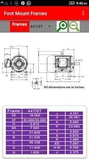 Ukuran Frame Motor Listrik sangat berguna untuk teknisi Listrik dan teknisi Listrik yang bekerja di bidang desain mesin dan pemeliharaan. Setiap ukuran motor dapat dipetik dalam detik dan dibandingkan dengan yang lain untuk pencocokan dan modifikasi perubahan tempat tidur mesin. Ini adalah aplikasi off-line. Ukuran frame sesuai standar NEMA. Dimensi dalam format Gambar dan mudah dimengerti.