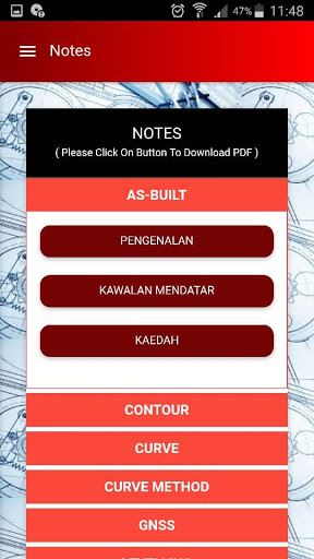 Antara kandungan topik yang terdapat dalam aplikasi ini ialah levelling, contour, mass haul, curve, setting out dan as built survey.