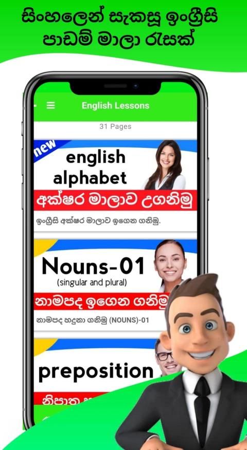 Ada banyak hal tentang berbahasa Inggris, menulis, kosa kata, dan banyak lagi. Pelajaran bahasa Inggris, dialog, tata bahasa yang penting untuk kehidupan sehari-hari termasuk banyak pelajaran bahasa Inggris yang meningkatkan bahasa Inggris Anda. Ada banyak pelajaran bahasa Inggris yang dipelajari di Sinhala.