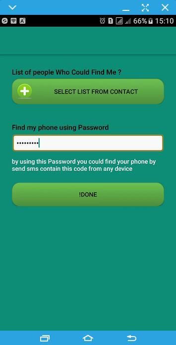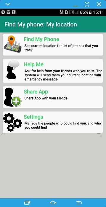 Aplikasi ini memungkinkan Anda untuk menemukan ponsel Anda menggunakan teman atau telepon keluarga, sehingga Anda harus memilih daftar orang yang Anda ingin untuk memungkinkan mereka untuk menemukan ponsel Anda, dan daftar orang-orang yang Anda akan menemukan mereka, Anda juga bisa menemukan Anda telepon dari perangkat yang tidak memiliki aplikasi ini dengan mengirimkan SMS berisi password pribadi Anda ke telepon Anda
