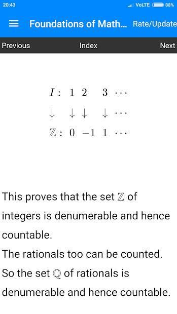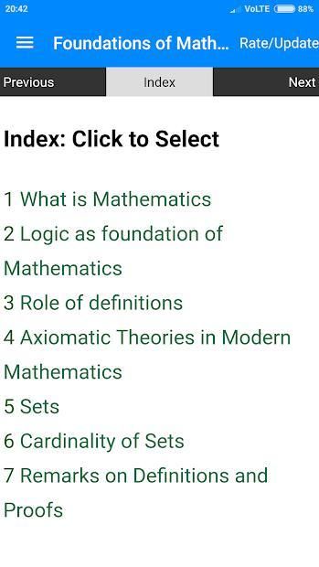 This app gives a concise introduction to Foundations of Modern Mathematics. The emphasis is on rigorous treatment of definitions, arguments, proofs etc. The topics covered are