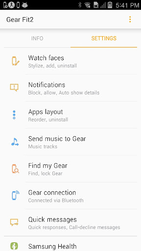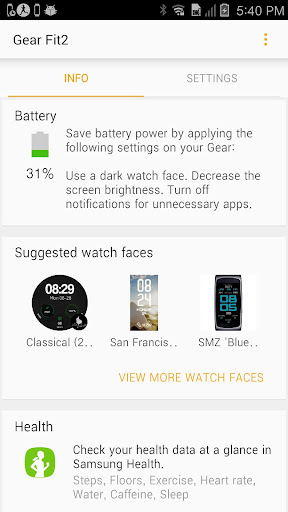 Gear Fit2 Plugin adalah aplikasi wajib yang menyambungkan Gear Fit2 dan perangkat seluler yang kompatibel tanpa gangguan. Perangkat lunak ini diperlukan untuk menyediakan berbagai fitur Gear Fit2 termasuk aplikasi & pengaturan/manajemen perangkat, pembaruan perangkat lunak, dan tampilan jam.