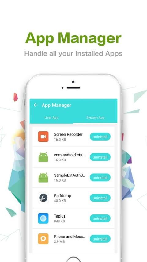 Bersihkan file sampah yang menempati ruang penyimpanan Anda. Mengoptimalkan kinerja dengan menghapus semua jenis file yang tidak berguna Android sistem, cache aplikasi, file sisa dll Hanya satu-tap, menikmati telepon lebih cepat.