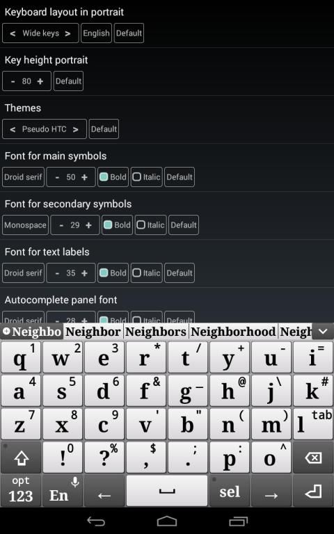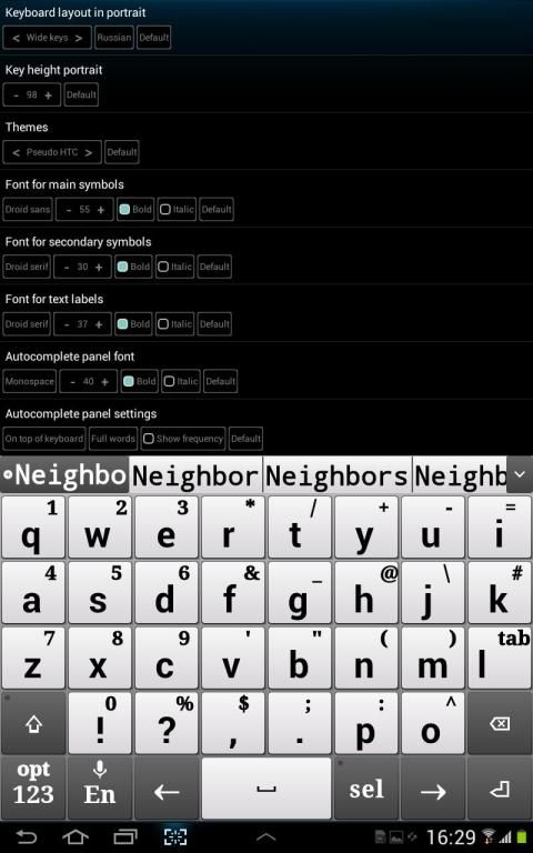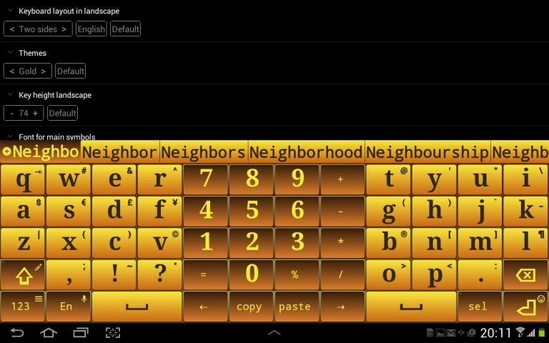 Keyboard is very small but has many functions and settings. Here you can find many keyboard layouts for more than 60 languages. For 30 languages you can download dictionary and it gives additional features: text input using gestures, word corrections.