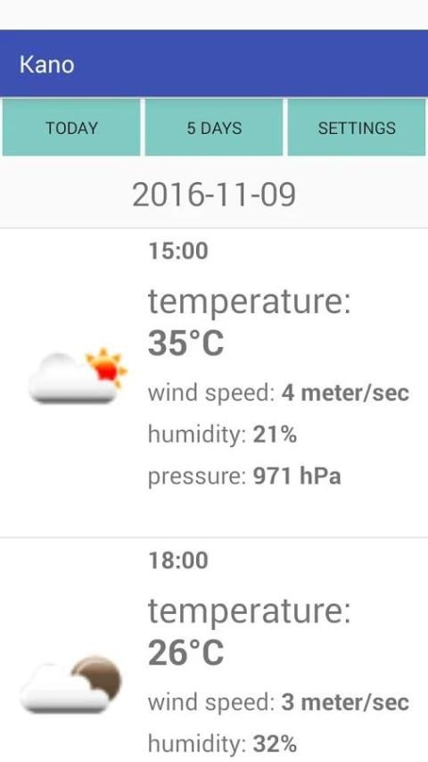 Cuaca Kano, aplikasi menampilkan ramalan cuaca sederhana dan nyaman untuk kota Kano.