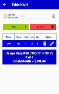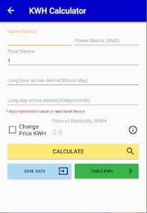 - perhitungan KWH (bisa memasukan daya peralatan listrik anda secara manual dan memasukan data harga per KWH)