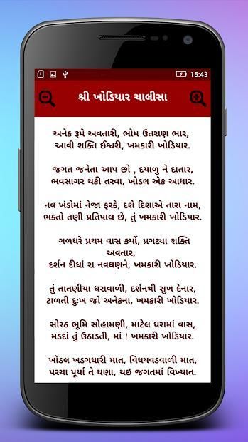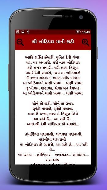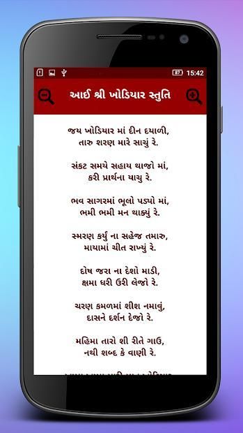 This app gives you Maa Khodiyar's Aarti, Stuti, Prarthna, Chalisa, Chadi in Gujarati language.