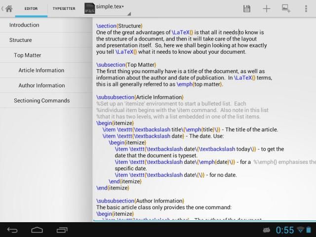 LaTeX Editor memungkinkan Anda untuk menulis kode LaTeX dan kemudian menghasilkan (offline) output dalam beberapa format. (PDF, JPG, PNG, dan SVG WebP). Ini mencakup beberapa paket LaTeX dasar untuk penyusunan dokumen sederhana, namun bila diperlukan secara otomatis men-download yang baru.