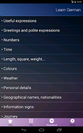 Aplikasi ini berisi pertanyaan, jawaban, kata dan frasa, yang memungkinkan pengguna untuk berkomunikasi dalam situasi standar yang terkait dengan perjalanan dan tinggal di luar negeri dan dapat digunakan sebagai bantuan dasar bahasa.
