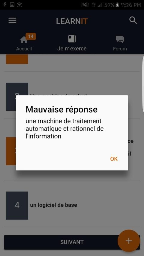 L'application propose une rubrique Je m'exerce ou les apprenants peuvent tester leurs connaissances et être immédiatement corrigés.