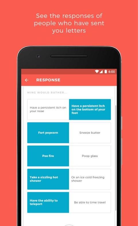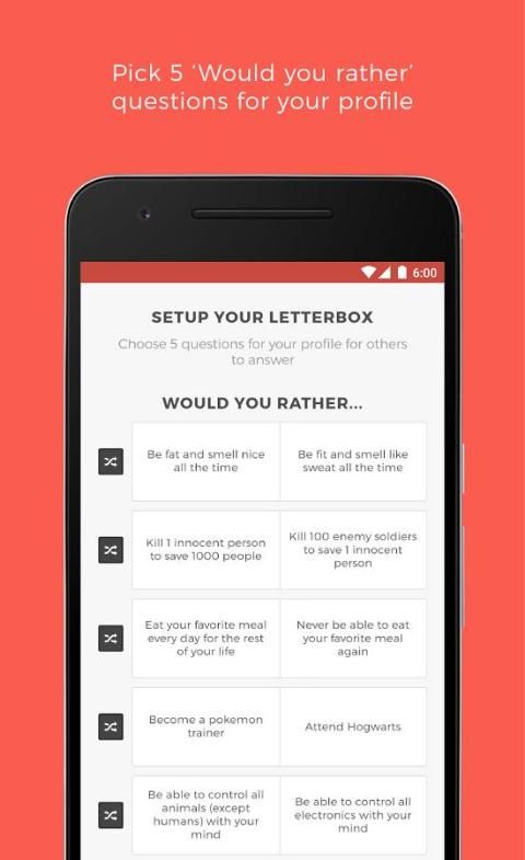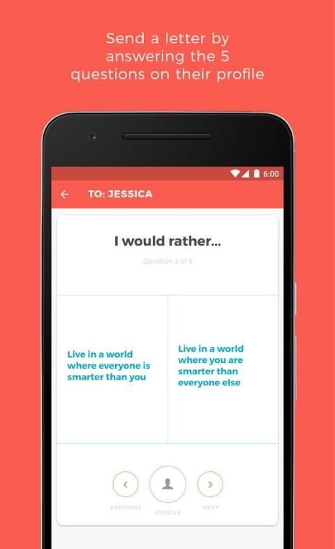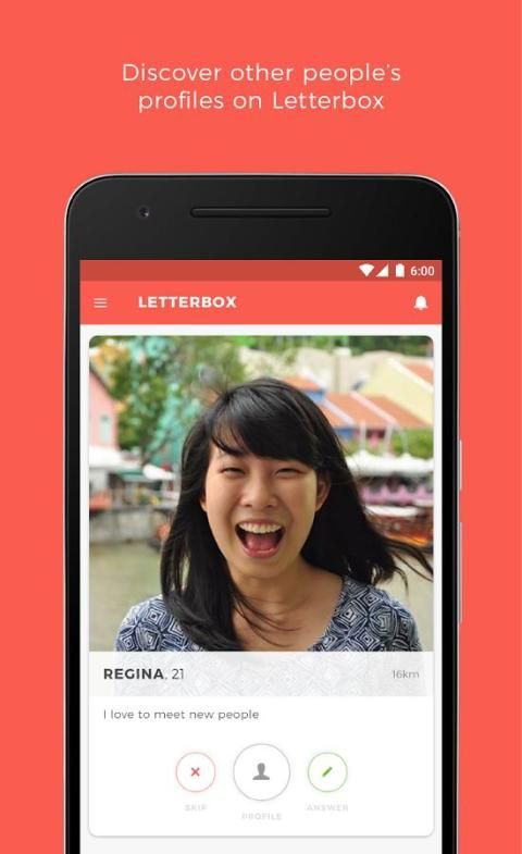 Letterbox is a dating app that enables you to find people with compatible mindsets and opinions. In Letterbox, you will choose 5 such questions for others to answer and you will be able to start a chat with them if you like their answers.