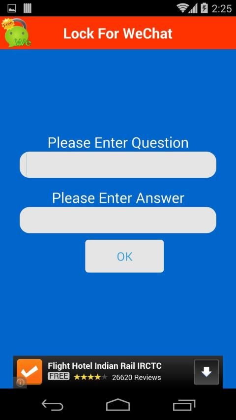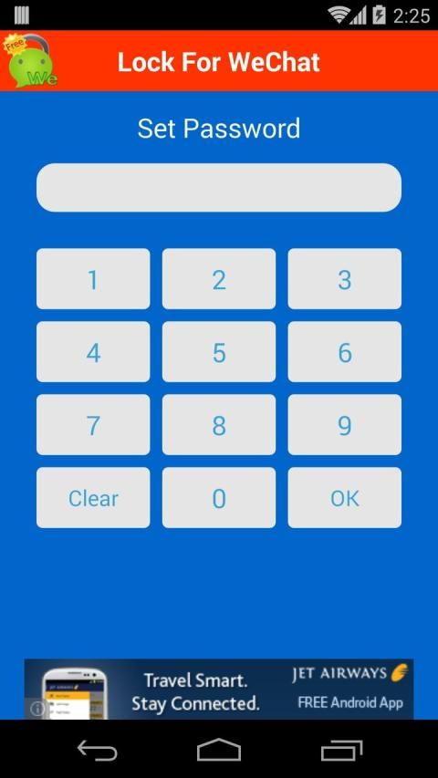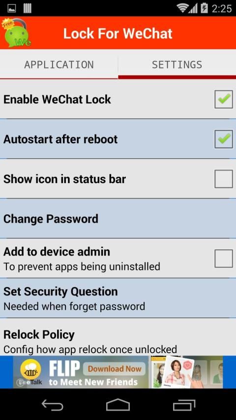 Lock for WeChat for your Android. Password protected access for your WeChat application. With Lock WeChat App, you can lock your WeChat app with your own password and prevent your friends, family members, coworkers or any other people from getting into the app in your Android without your permission. Features: * Quickly Enable/Disable the lock * Neat & simple User Interface * Low memory consumption. * Password Recovery With Question/Answer * Number Lock * Pattern Lock * Re lock Policy Protect your WeChat from unwanted access. WeChat Lock allows you to lock your WeChat with a unique password so that no one can access WeChat on your BlackBerry® without your permission. WeChat lock is very optimized application, in terms of memory and battery consumption. Neat and clean user interface, with beautiful graphics. Let's face it, when it comes to Android, whether you like the official WeChat application or not it has one major flaw: no notifications! And this is even more true when you don't use any app for WeChat at all but just the browser, and yet want to keep updated. I frankly hate this: why would you have to check for updates yourself when you could get automatically notified whenever a notification from your WeChat account arrives, just as iPhone users do? I decided to solve this issue for my own convenience, and so this is where this app chimes in: a lightweight and fast application to get notifications from WeChat, what you decide, at the interval you decide and reported as you decide. Nothing else, just as plain and simple as effective! Choose between general notifications, private messages, friend requests, events, birthdays, pokes, online friends and lost friendships and decide how to view the notifications: Features: - Easy configuration. - Password Protection for WeChat. - Password Protection for WeChat Messenger. - Easy mode for App Status – Switch on & off. - Less Battery and Memory consumption. - Fully Touch Supported. - Easy Password Recovery by Email, SMS or Security Question.