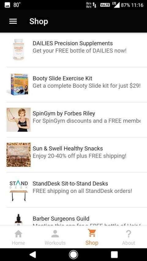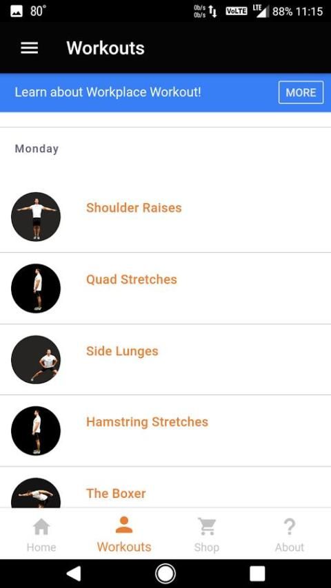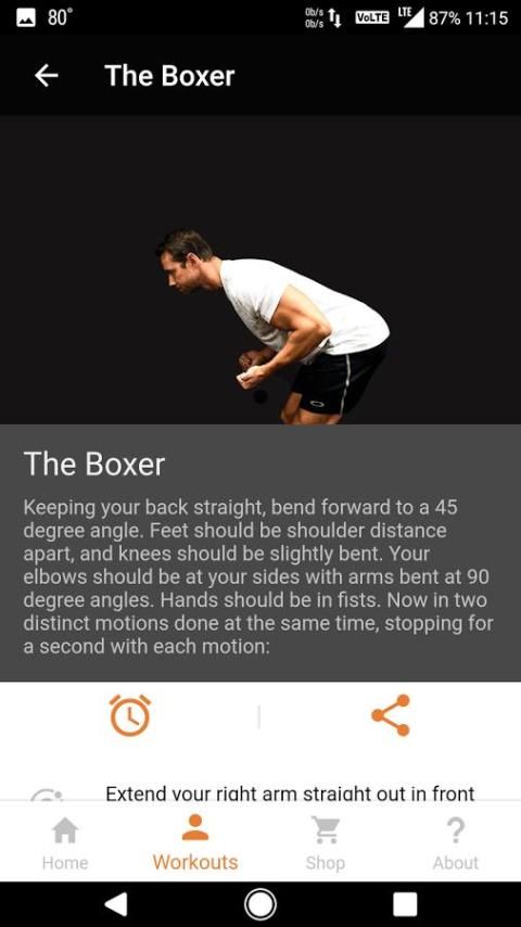 Setiap hari memiliki serangkaian enam mikro-latihan dengan deskripsi dan gifs animasi untuk menunjukkan bentuk yang tepat, dan timer untuk mengatur untuk satu menit latihan atau tiga menit latihan.