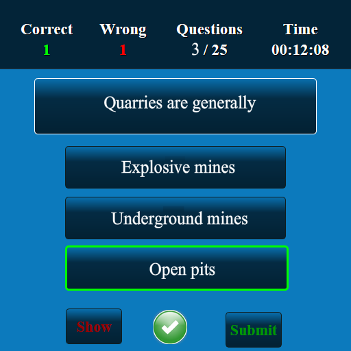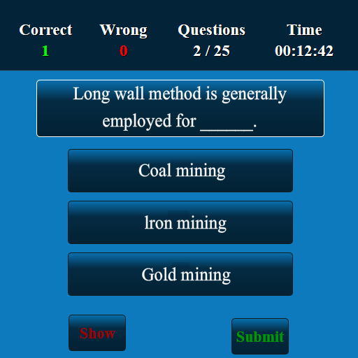 This Mining Engineering app has been developed for testing your skills of Mining Engineering . This app has more than 10,000 multiple choice questions and answers. This Mining Engineering quiz app suits for all lower, intermediate and higher levels. The questions at all levels will be displayed randomly. The user can improve Mining Engineering knowledge and user can score well in high school, college and competitive level examinations. This is a free version and you can be used in both offline and online.