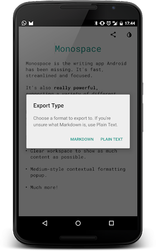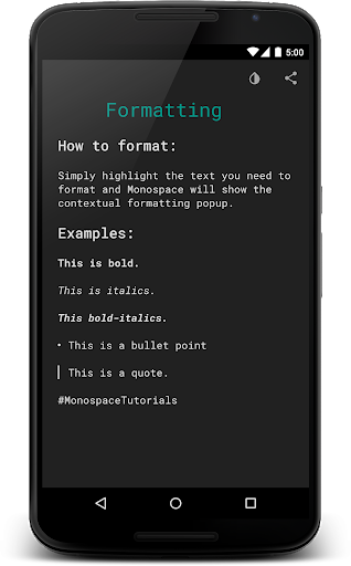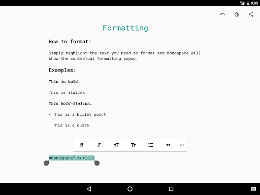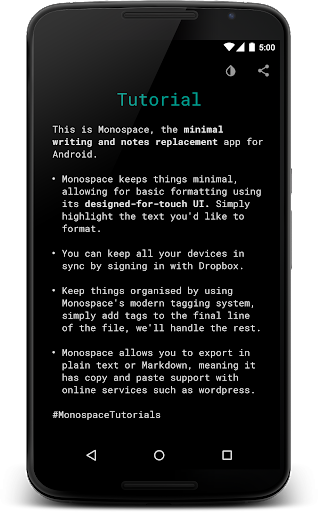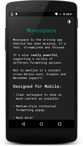 Monospace adalah aplikasi minimal dan aplikasi penulisan, dibangun dari bawah ke atas dengan UI yang dirancang untuk sentuh.
