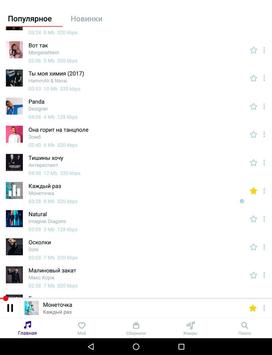 Музыкальный взрыв в твоем телефоне! Слушай новинки и хиты онлайн или сохраняй на своём устройстве. Создавай собственные плейлисты или находи среди сотен разнообразных музыкальных подборок ту, которая будет по душе. А если не знаешь, что послушать, то раздел жанров поможет определиться с музыкальным направлением. Теперь не нужно скачивать каждый трек отдельно - скачай весь сборник и наслаждайся музыкой без Интернета.