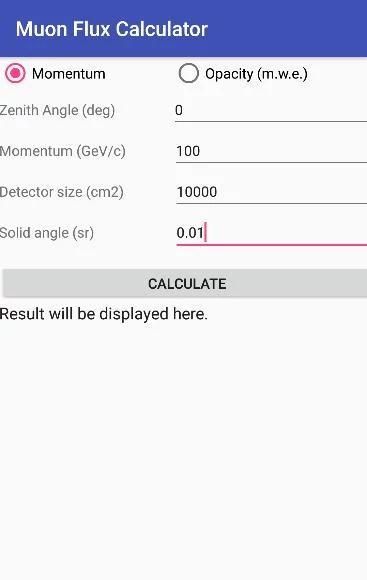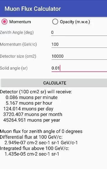 Aplikasi ini membantu Anda untuk menghitung sinar kosmik muon fluks untuk setiap sudut zenith diberikan dan energi. Jika Anda memberikan ukuran dan sudut padat dari detektor, aplikasi menghitung jumlah yang diharapkan dari peristiwa muon tiba detektor.